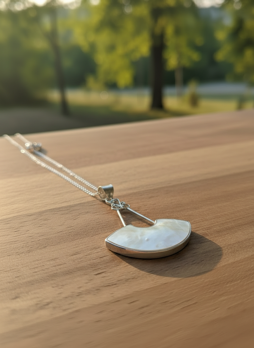 El Collar Amazona es una joya que enamora a primera vista. Su diseño en forma de media luna, elaborado artesanalmente en Plata de Ley 925, abraza una pieza de nácar o concha abulón que refleja la luz con destellos mágicos y naturales.