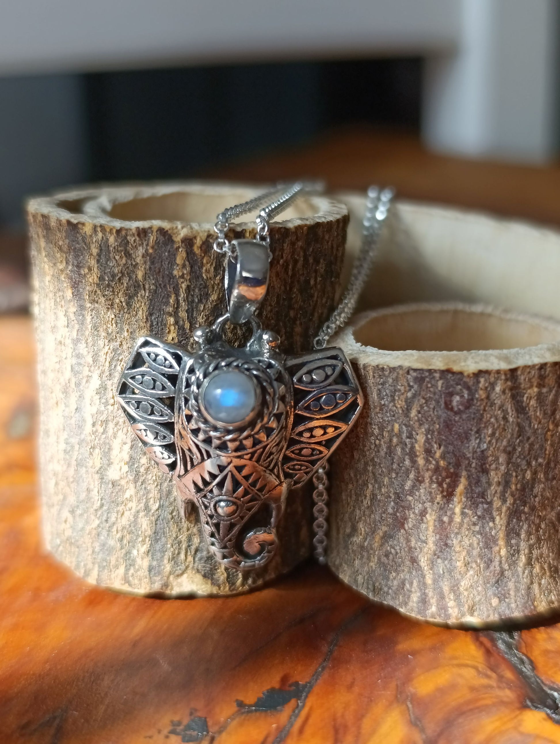 El collar Briana es mucho más que un accesorio: es un pequeño amuleto de poder y belleza. Fabricado en Plata de Ley 925, tiene la forma de una cabeza de elefante tallada con mimo, símbolo de sabiduría, protección y buena suerte. En su frente, una preciosa piedra luna natural refleja la luz con un brillo mágico y sutil, como si escondiera secretos antiguos.