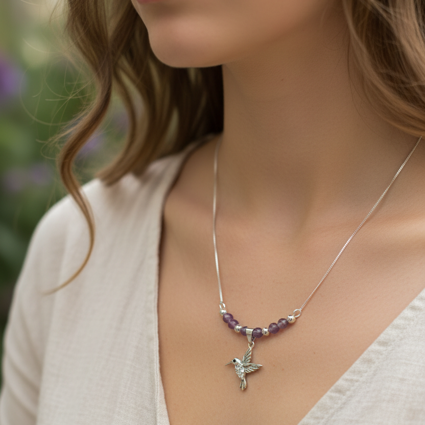 El Collar Paz es una joya llena de simbolismo y luz. Su delicado colibrí en Plata de Ley 925, adornado con una circonita blanca, representa la alegría, la libertad y la capacidad de disfrutar los pequeños momentos. Disponible con amatista o aventurina, es un collar pensado para transmitir calma, equilibrio y energía positiva en el día a día.