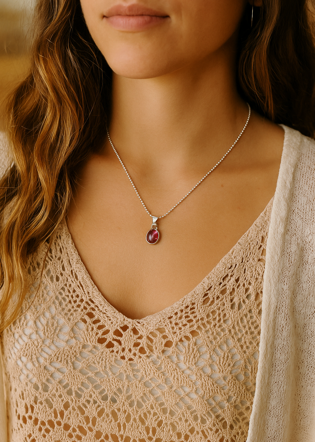 El Collar Rubí es una joya que simboliza la pasión, la energía y el amor eterno. Elaborado en Plata de Ley 925, luce un colgante con un rubí natural talla cabujón ovalado que irradia calidez y fuerza interior. Su diseño sencillo y atemporal lo convierte en el complemento perfecto para cualquier ocasión, desde un look diario con un toque especial hasta un conjunto más elegante.